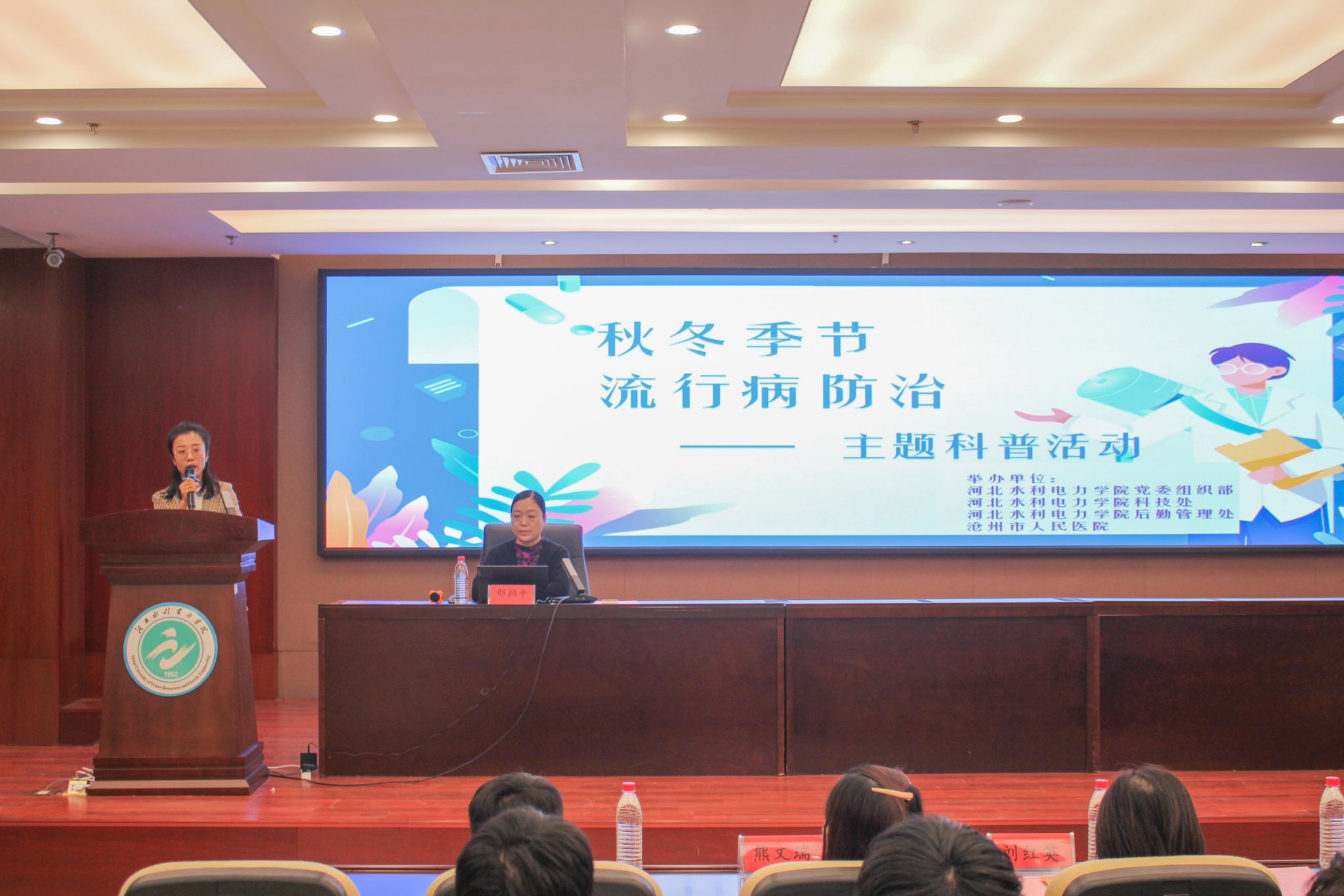 10月19日下午,学院党委组织部、科技处、后勤管理处联合沧州市人民医院开展了以“秋冬季流行病的防治”为主题的科普宣讲活动。沧州市人民医院呼吸老年医学科主任邢颜平、科研处副主任熊文瑞、区域医疗合作办公室王磊,学院党委组织部、后勤管理处相关负责同志、科技处全体成员,学校青年教师和学生代表,共计三百余人参加了此次活动。报告中,邢颜平主任介绍了当前秋冬季节常见的流行病,如流感、肺结核等,并详细解读了这些疾病的症状、...