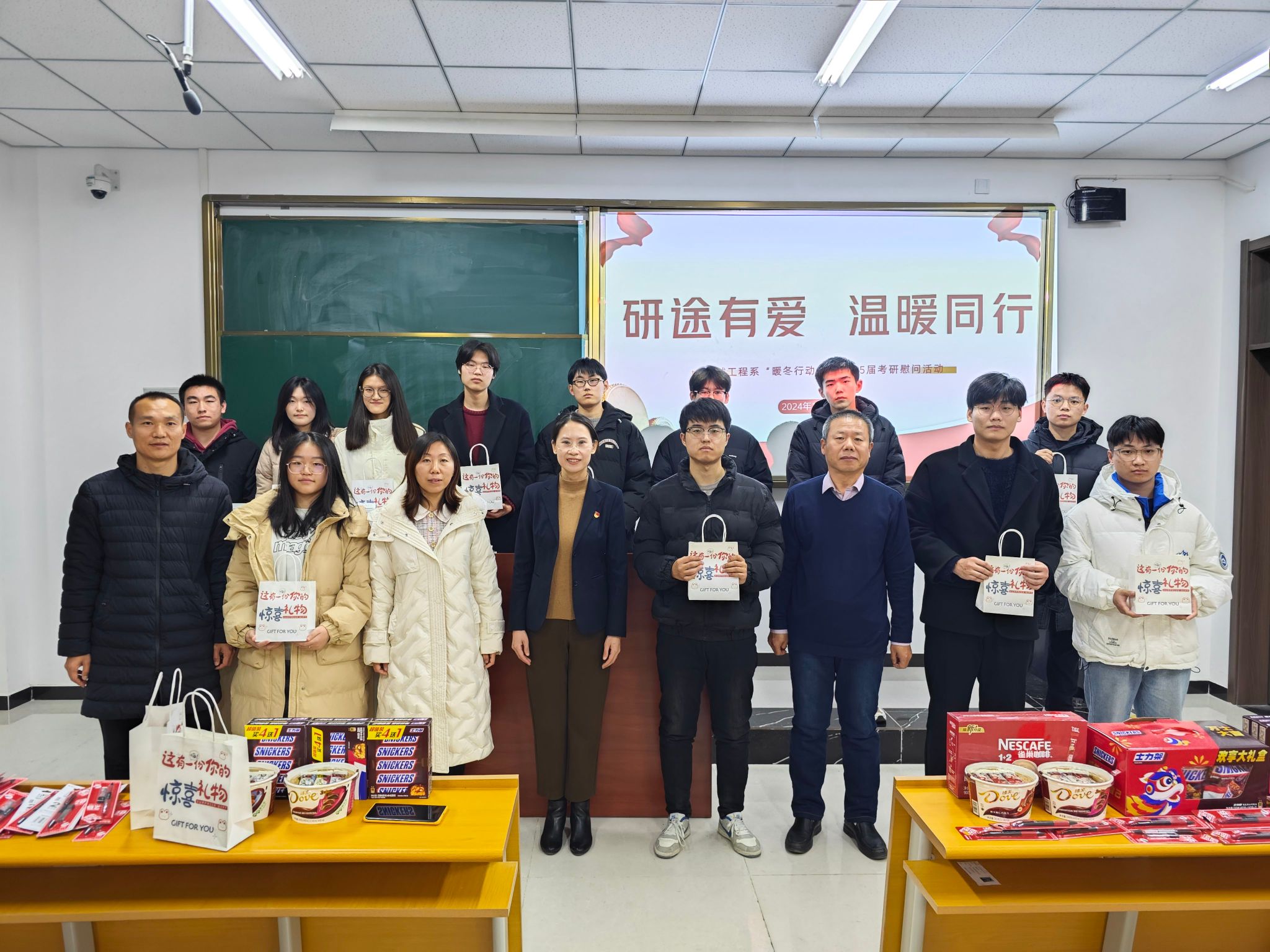 在考研关键冲刺阶段,机械工程系开展了“研途相伴 温暖同行”暖冬行动之考研慰问活动,旨在为即将踏上考场的莘莘学子送去关怀与力量,助力他们在考研的征程中奋勇前行。机械工程系党总支书记路维、主任张铁壁、副书记杨学智、副主任石岩、团委书记贺欢呼以及毕业班辅导员等参加活动。活动当天,老师们为考研学子送上精心准备的慰问礼包。礼包内不仅有考研文具,还有巧克力、士力架、咖啡等能量补充食品,象征着为同学们的考研之路提供“...