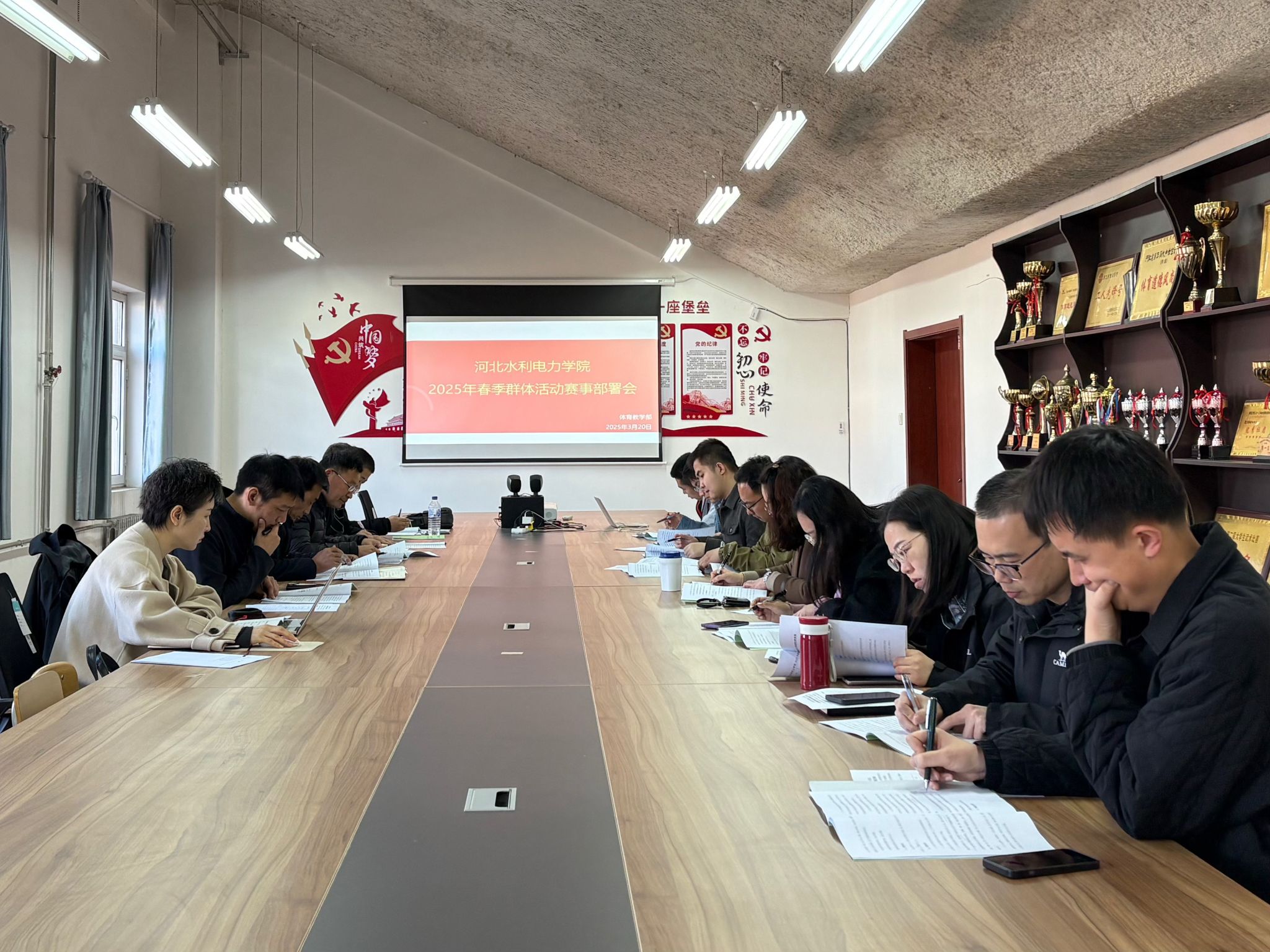 为深入贯彻落实“健康第一”的校园体育理念,统筹推进本学期学生群体活动高质量发展,3月20日上午,体育教学部在体育场会议室举行了2025年春季群体活动赛事部署大会。大会由体育教学部主任周保国主持,各系负责人参加了会议。会议以“规范流程、参与广泛、育人实效”为主线,重点研讨了本学期学生群体赛事的整体安排。周保国首先宣读了我校本学期学生群体赛事的活动安排,对即将开展的第八届男子足球联赛和第七届体育运动会进行了详细介绍,...