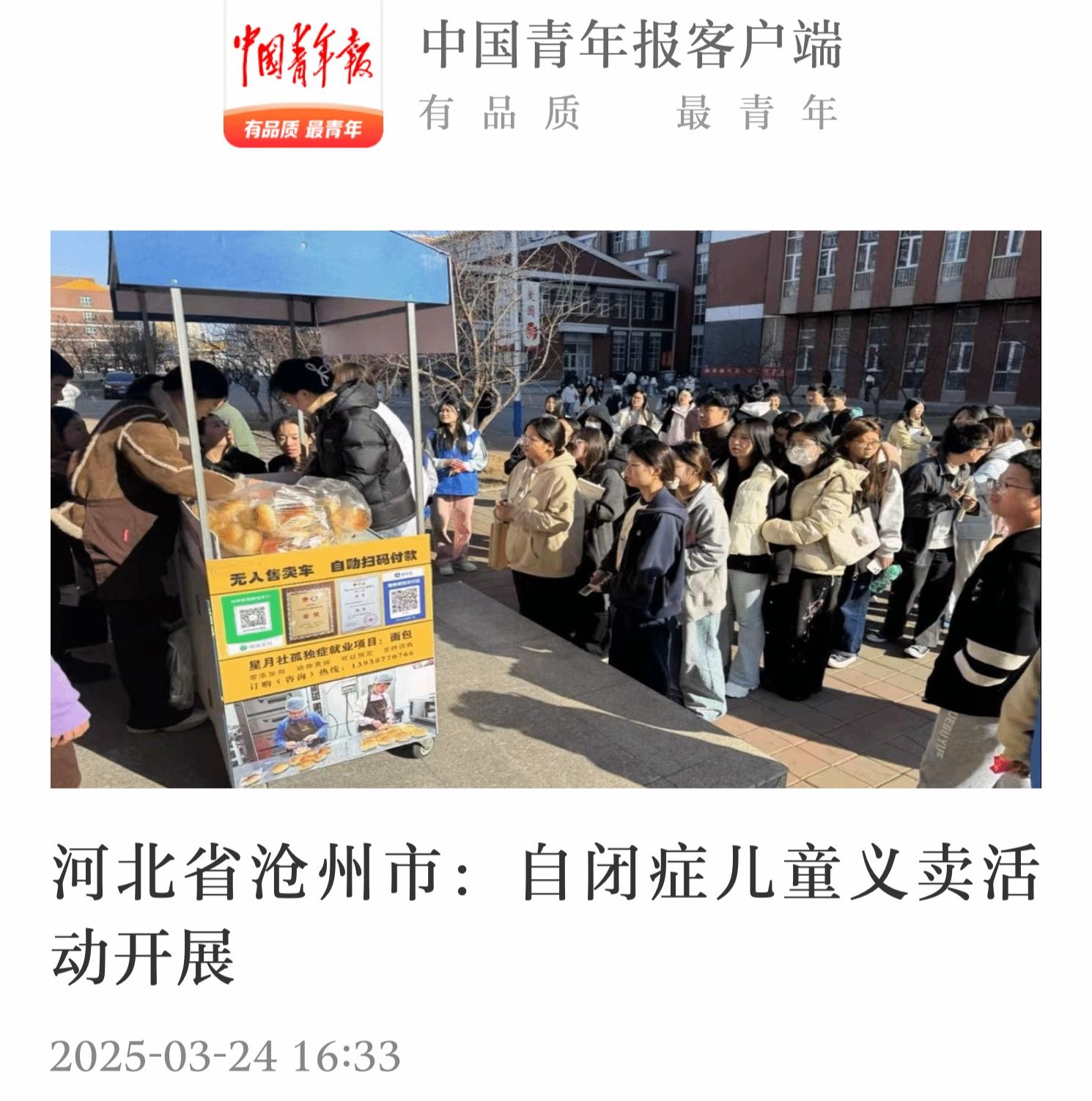 3月18日,我校团委联合共青团沧州市委为自闭症儿童举办的“微光照亮人生,烘焙传递温暖”面包义卖活动被沧州市级媒体报道后引发社会关注。3月24日,中国青年报客户端报道本次主题义卖,进一步扩大了我校的社会影响力。今后,我校将持续深入实施“小橘灯”助残接力计划,并参与更多社会公益活动,持续聚焦特殊儿童和需要帮助的群体,发挥大学生和青年团体的志愿服务优势,扩展志愿服务“实践育人”功能,弘扬奉献精神和社会责任,凝聚起更多爱心力量,...
