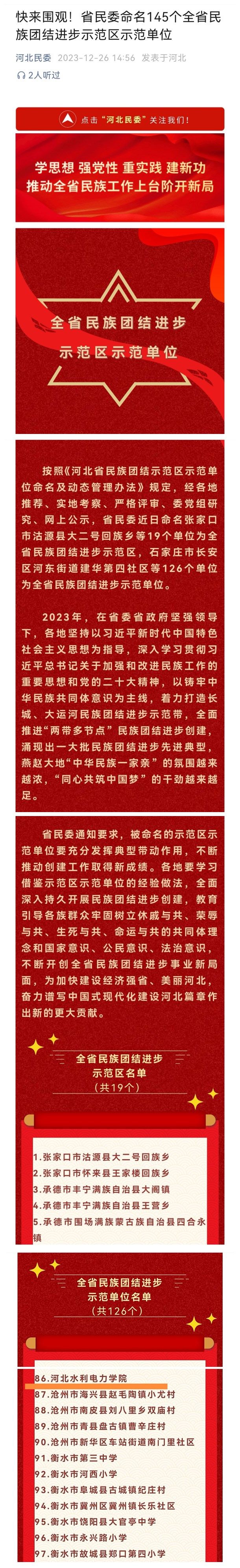 12月26日,河北省民族事务委员会发布命名文件,公布了省级民族团结进步示范区示范单位名单,全省共评选出19个民族团结进步示范区和126个示范单位,我校被命名全省民族团结进步示范单位!