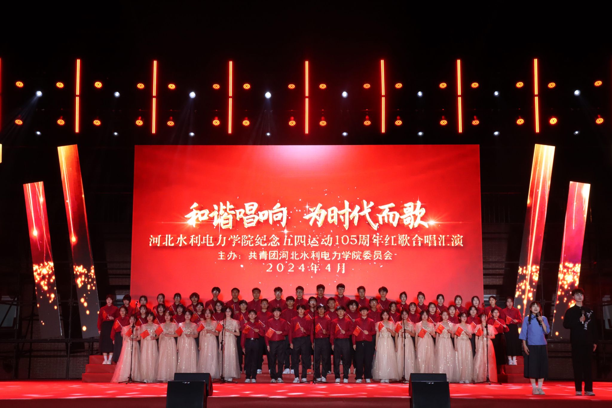 在热烈的掌声中,MK体育(国际)官方网站,mksport,2024年五四红歌汇演拉开帷幕。首先,张烨老师和大学生艺术团带来了精彩表演,青春洋溢的歌声为晚会营造了热烈的氛围。由水利工程系带来的《英雄赞歌》和《最可爱的人》点燃了现场观众的激情。《爱我中华》、《歌唱祖国》、《红旗飘飘》等一首首经典歌曲,将同学们的思绪拉回了一百多年前的青葱岁月,飞扬的歌声吟唱着难忘的岁月,熟悉的旋律演绎着时代的乐章。由交通工程系带来的歌曲《没有共产党就没有新中国》和《灯火里的中国》将现场气氛推向高潮。悠扬的旋律,洪亮的歌声,回放着岁月的记忆,引领着爱党爱国的豪情。
