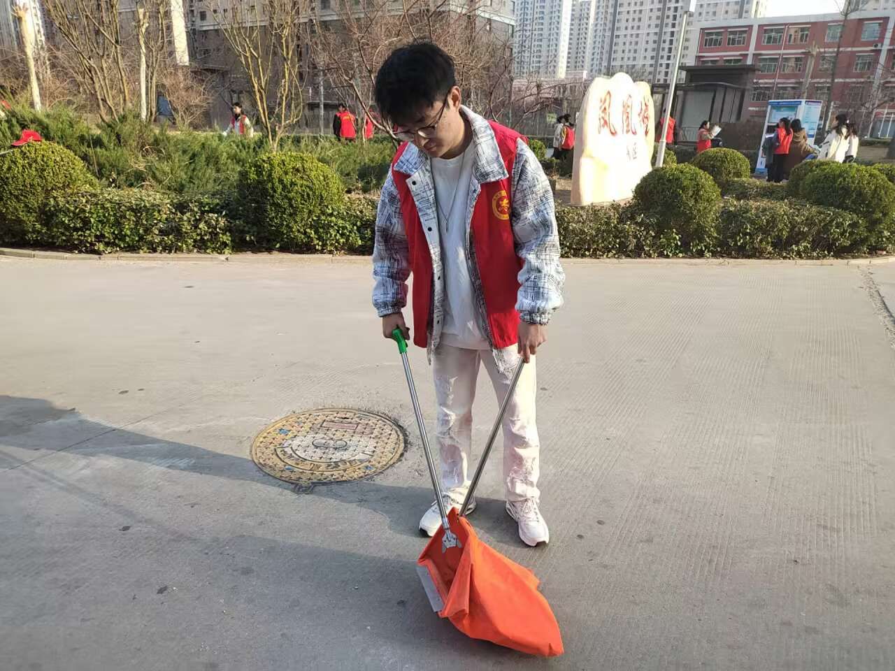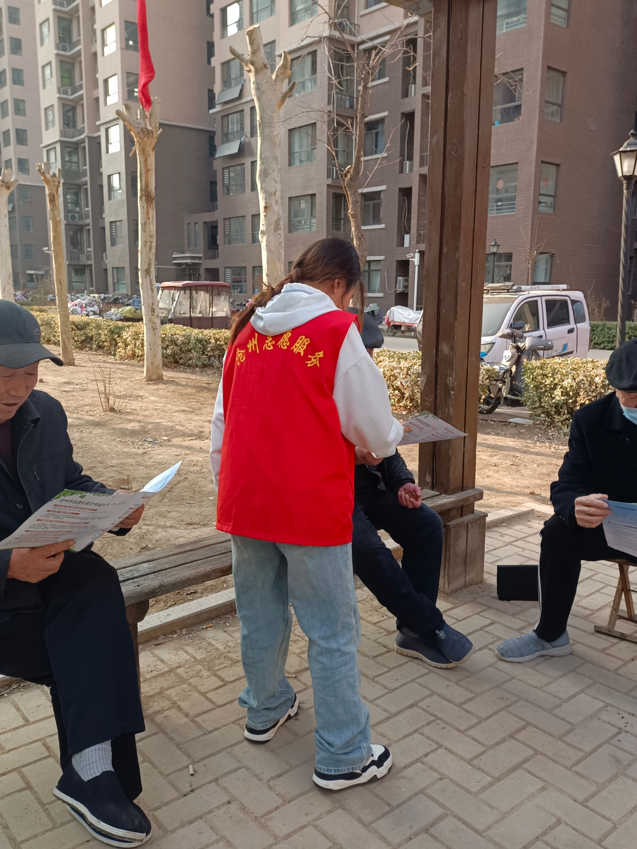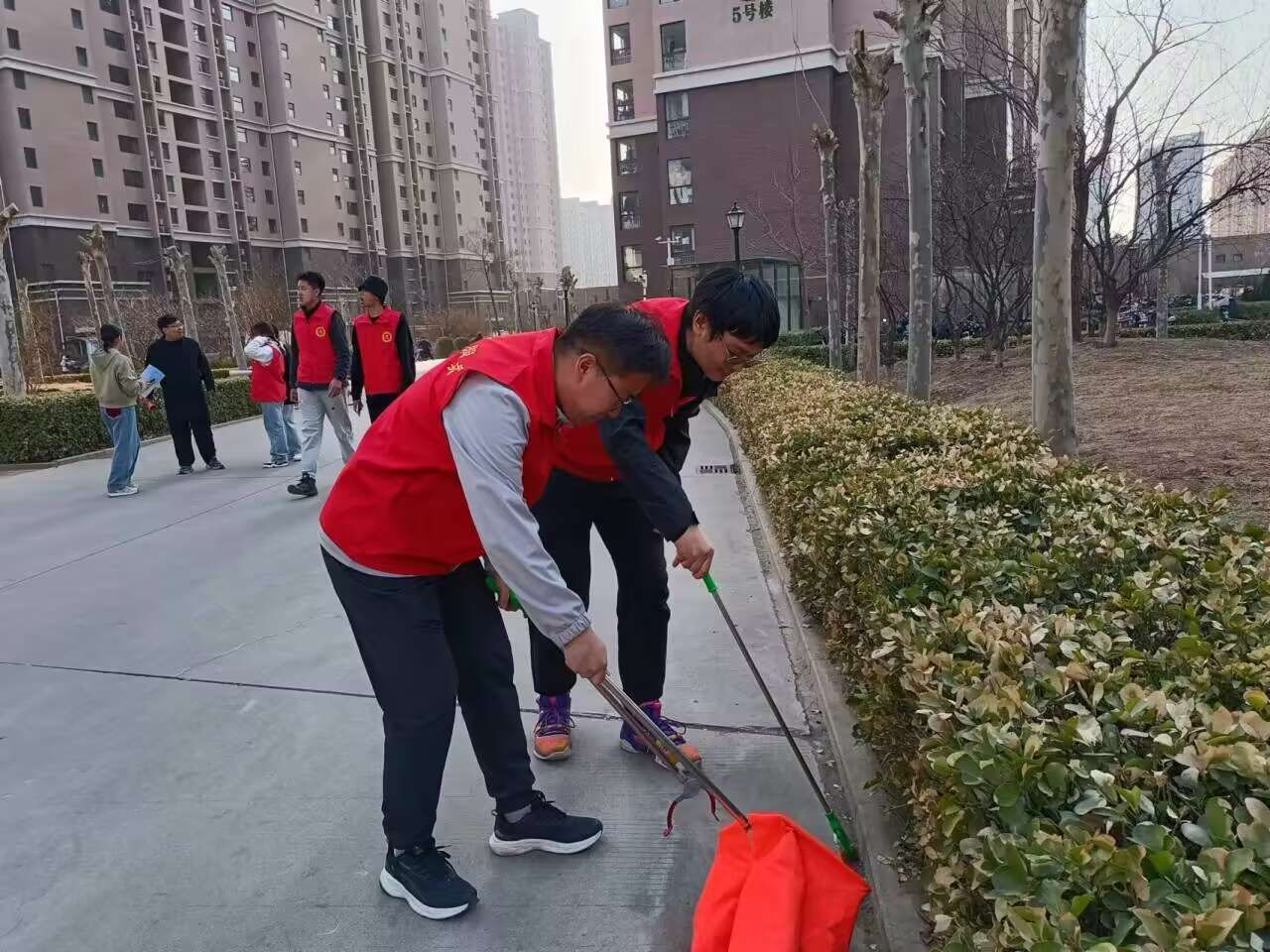 在活动过程中,大家身穿红色马甲,手拿扫帚、垃圾袋等清洁工具,对杂草、落叶、烟头、纸屑等垃圾进行仔细清理,对楼道旁张贴的小广告进行了清除,确保卫生清理全覆盖。将乱停放的电动车、自行车进行了规整摆放,并引导社区居民有序停车。党员志愿者们精神抖擞、干劲十足,从社区周边楼道、街道公共设施,到辖区内的卫生死角、绿化带,再到居民电动车停放处,做到“清理一处、靓丽一处”。大家共同参与,井然有序,经过一个多小时的辛勤劳动,社区环境变得整洁有序、焕然一新。他们的付出得到了居民与社区工作人员的肯定与赞扬。同时,党员志愿者们向来往居民分发《沧州市创建全国文明城市应知应会》宣传材料80多份,面对面讲解创城知识,宣传创城重要意义,进一步提升群众对创建全国文明城市的知晓度,引导群众积极参与创城工作。