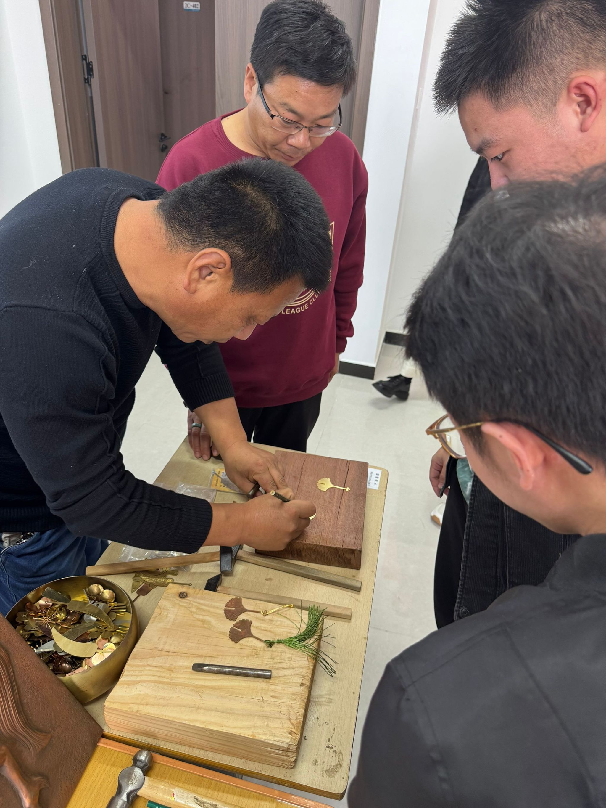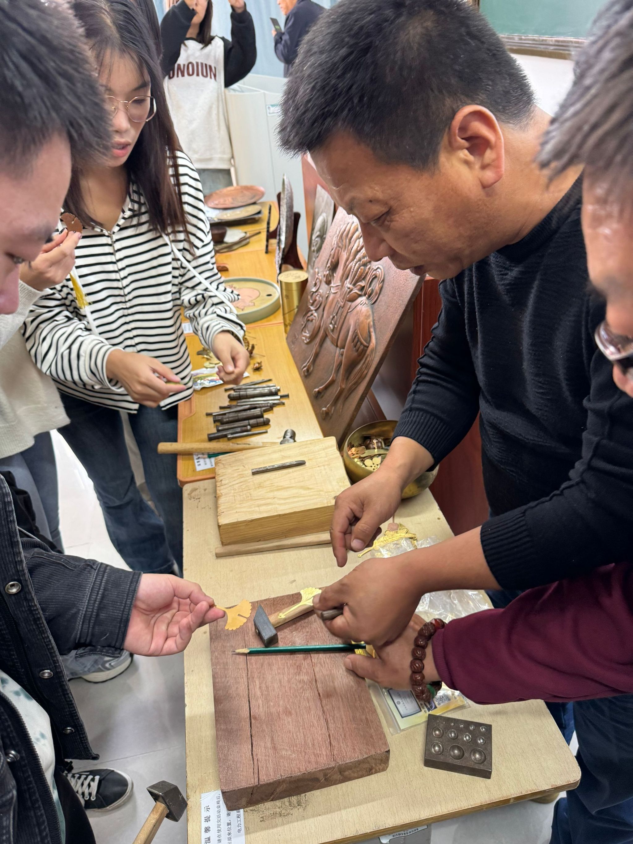 讲座中,王教授用朴实无华的语言解读了“工匠精神”和传统工艺的深刻内涵,用生动形象的案例分享了自己多年来“錾铜”人生的奋斗进取历程,亲自为学生示范了錾铜的全过程,并指导学生参与其中。同学们热情高涨、积极参与,伴随着一锤一锤的敲击声,大家初步完成了“錾铜”手工艺品制作。